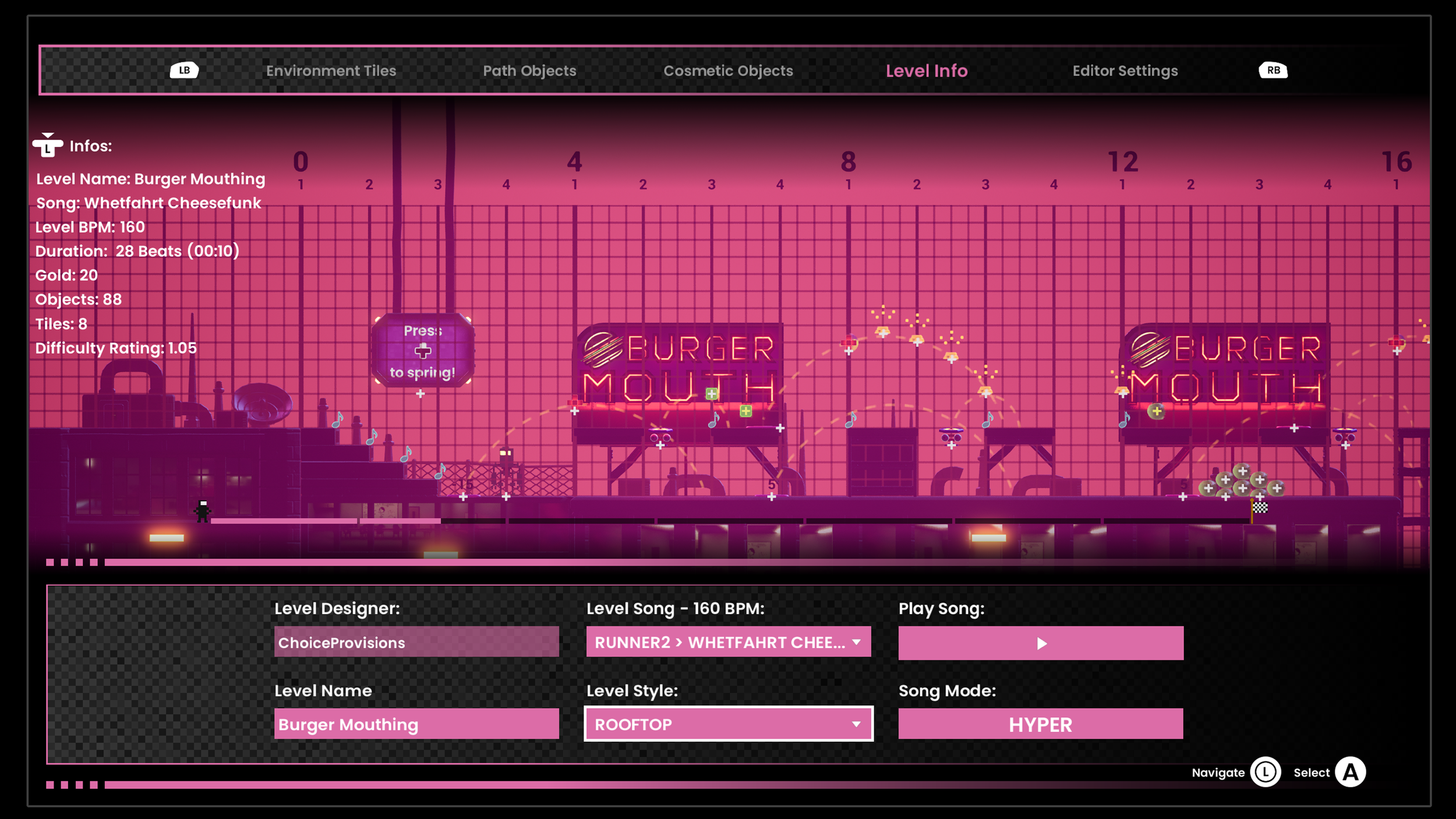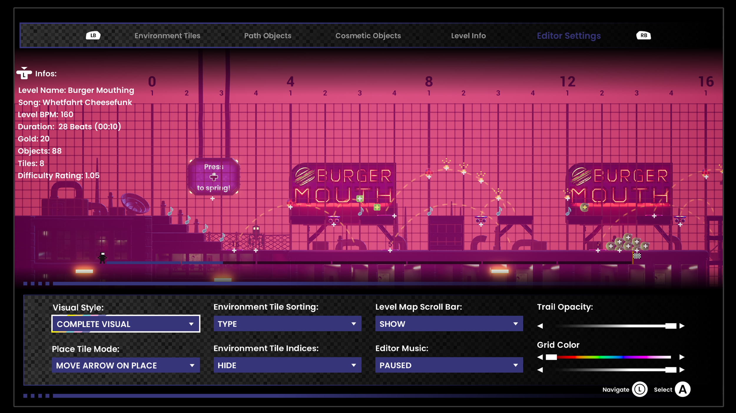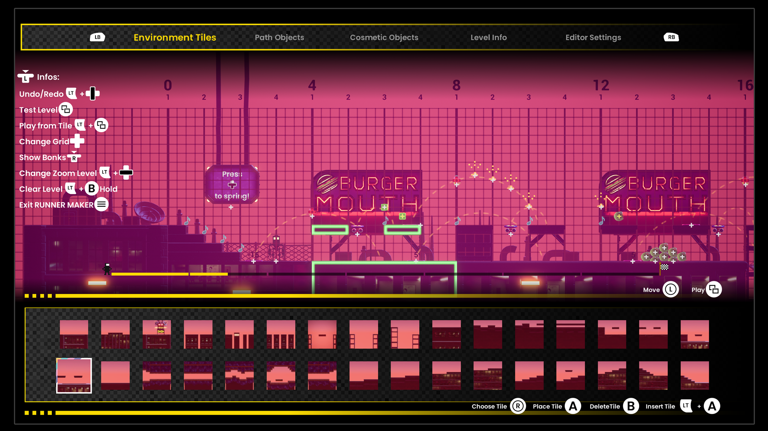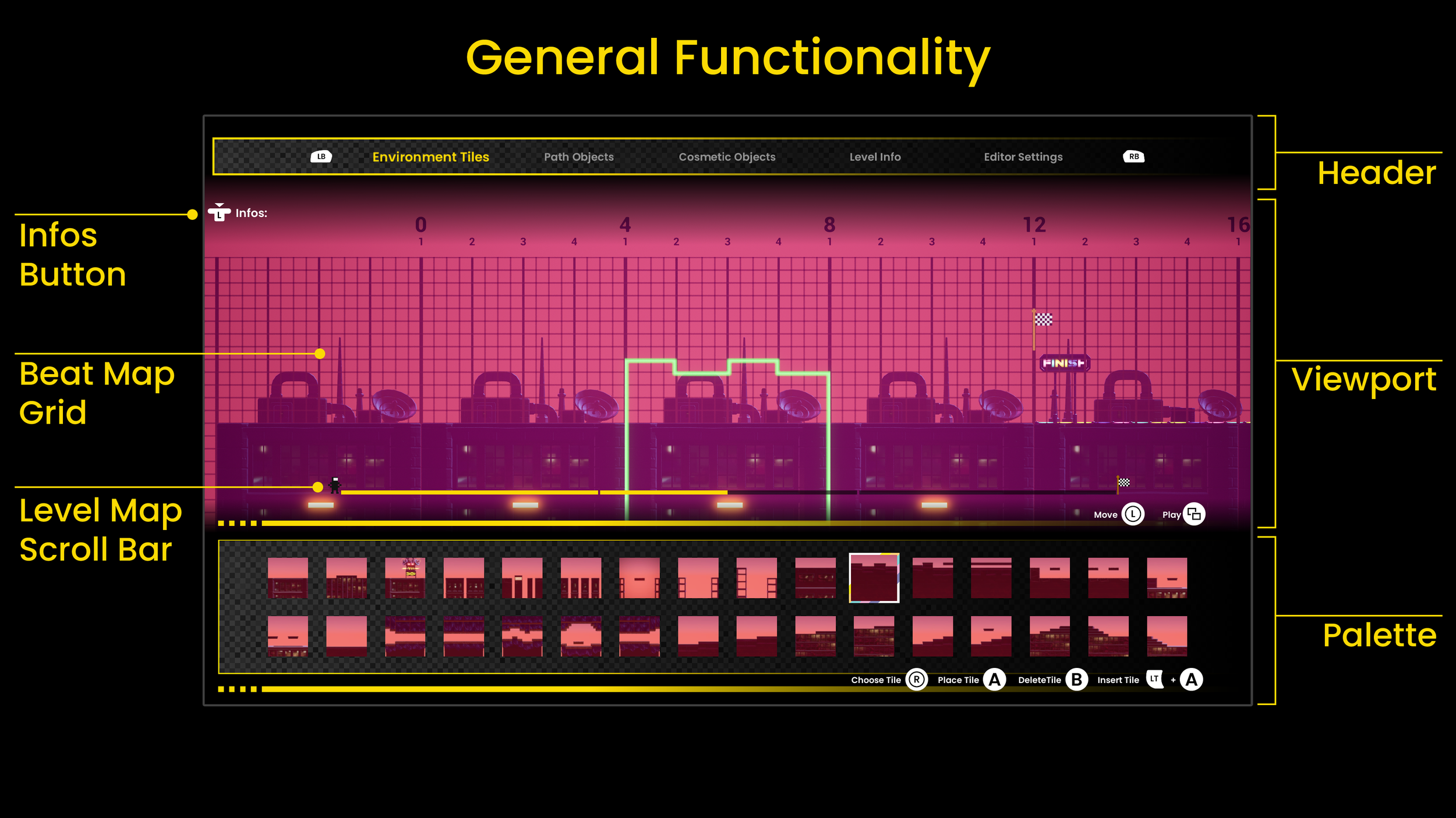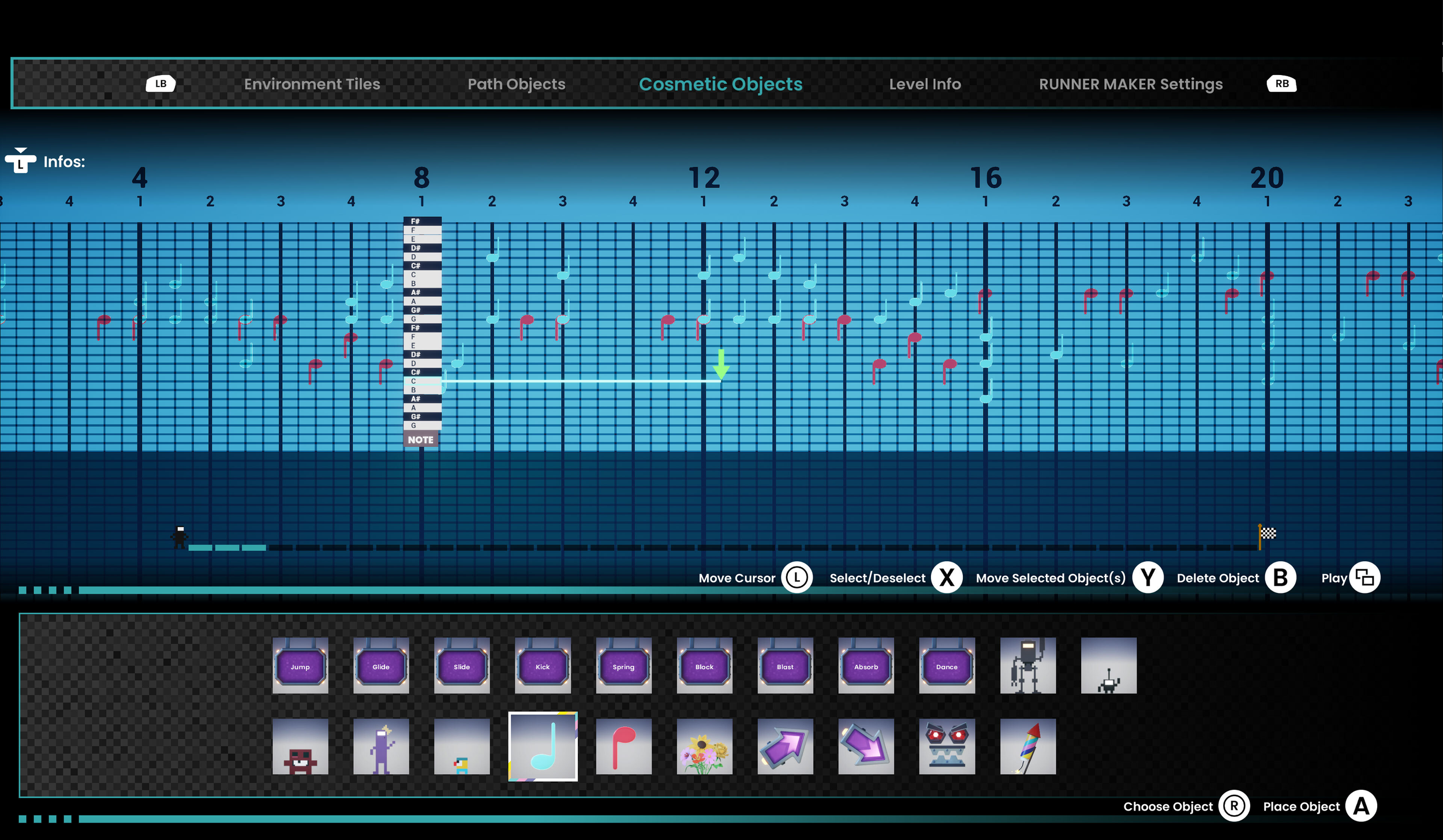BIT.TRIP RERUNNER now has a MUSIC MAKER that allows you to create original songs for your custom levels! By using the editor grid like sheet music, you can place MUSIC MAKER notes at different heights to create melodies, chords, and basslines during gameplay. You will find these new options in the editor: