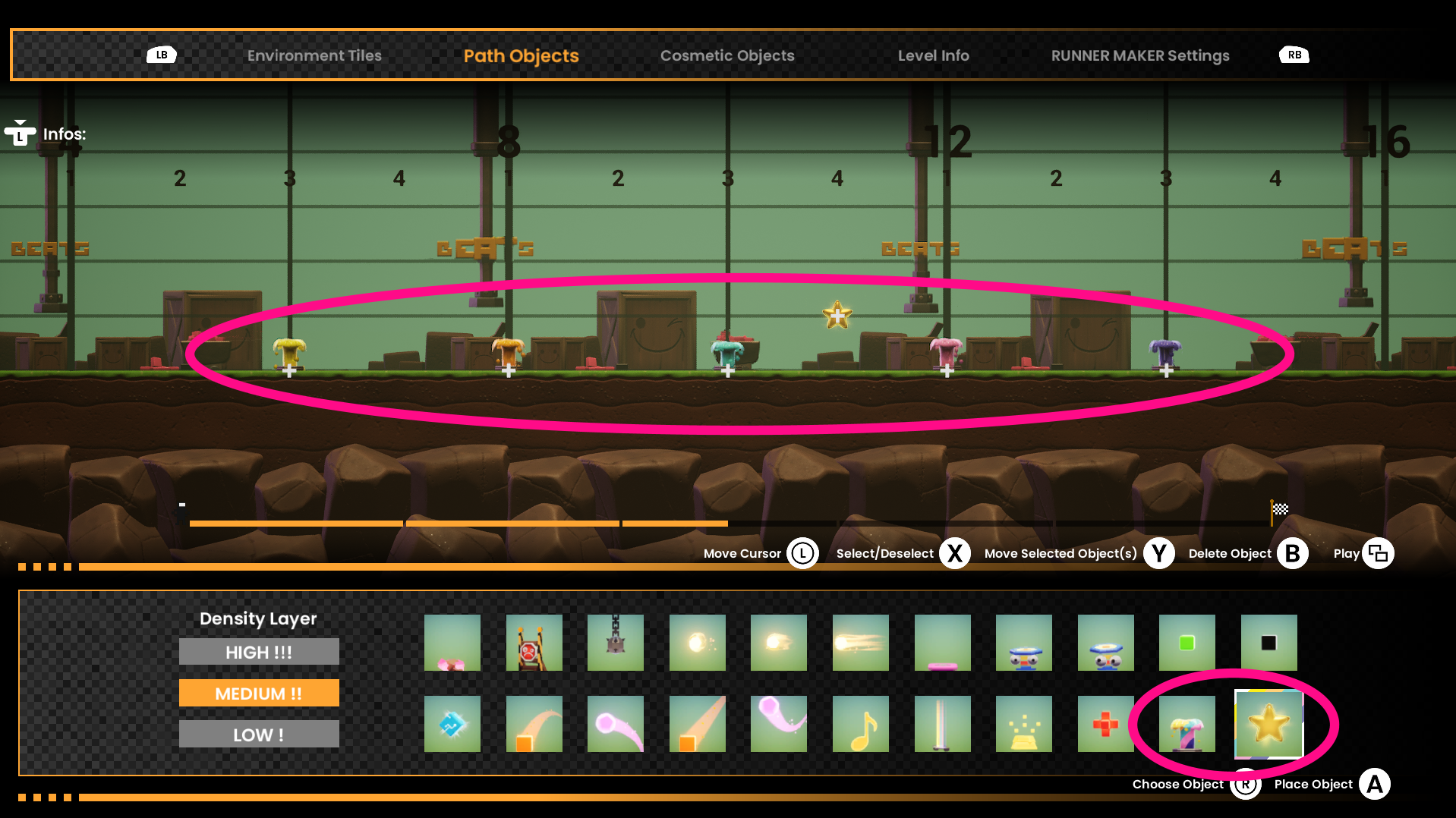 A good way to think about densities in BIT.TRIP RERUNNER is that LOW ! is MEDIUM !! gameplay minus some objects, and HIGH !!! is medium gameplay plus some objects