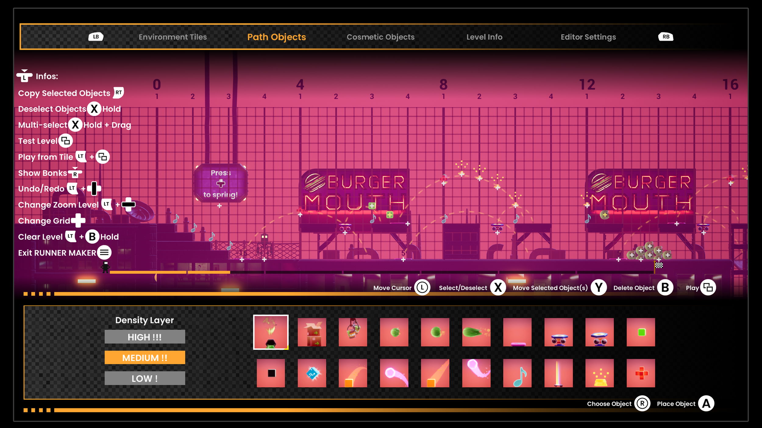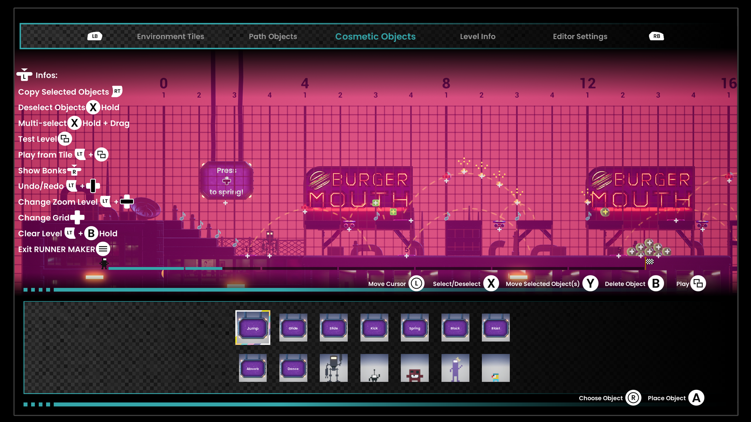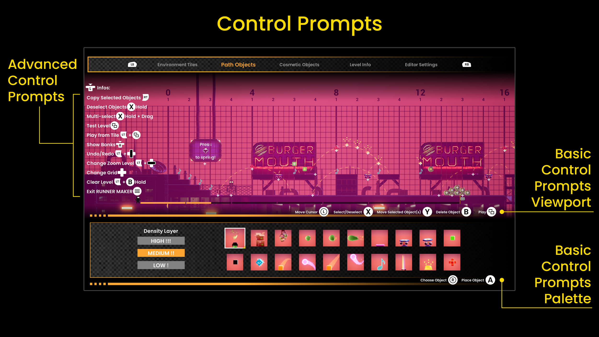 RUNNER MAKER’s basic control prompts are always present on screen, whereas the advanced control prompts can be viewed by toggling the info panel by clicking the Left stick