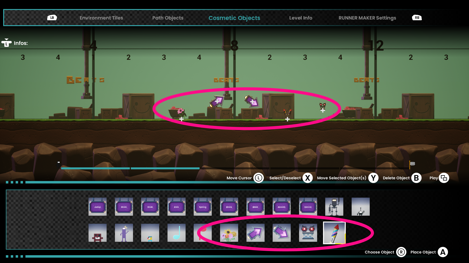 Cosmetic objects are for giving players hints on what actions they should take (or maybe for trying to trick them...) and for placing CommanderVideo’s friends to cheer him on!